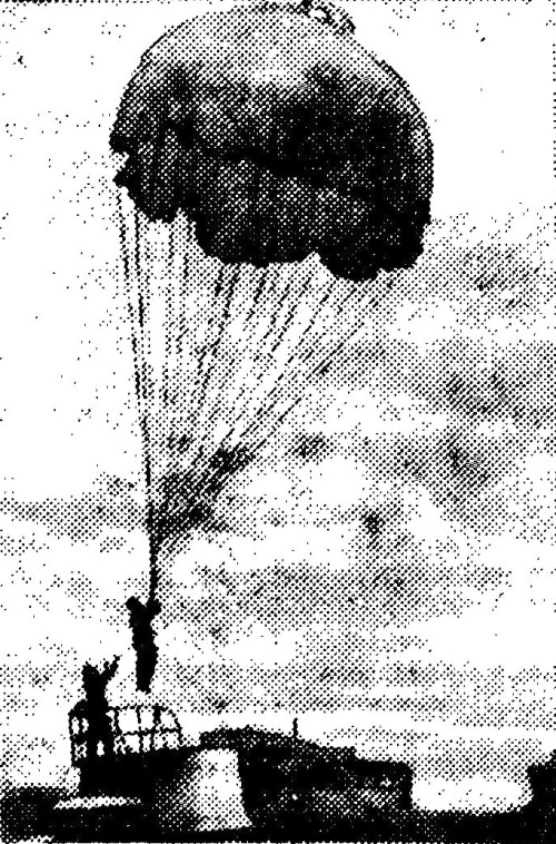 B Экспериментальном институте Наркомтяжпрома в течение последних лет были произведены опыты по использованию парашютов наподобие змеев для под'ема на большие высоты. Начальнику и главному конструктору института тов. Гроховскому удалось разработать остроумную конструкцию летающего парашютного поезда, при помощи которого можно поднимать людей на большие высоты, вплоть до стратосферы.